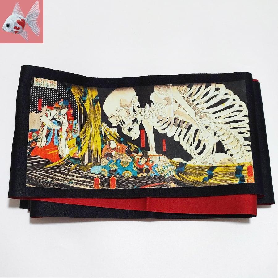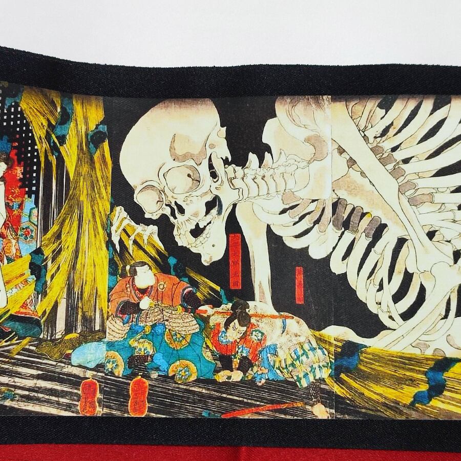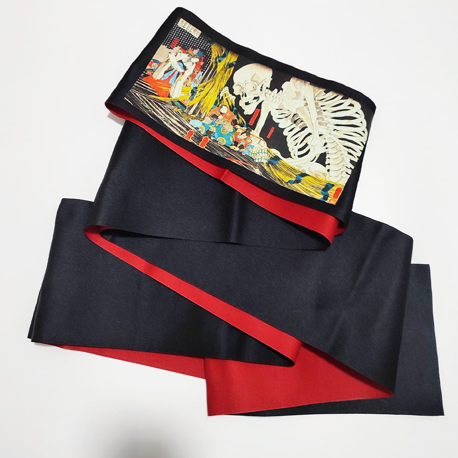 歌川国芳・相馬の古内裏の柄がプリントされた、黒赤の半幅帯です。