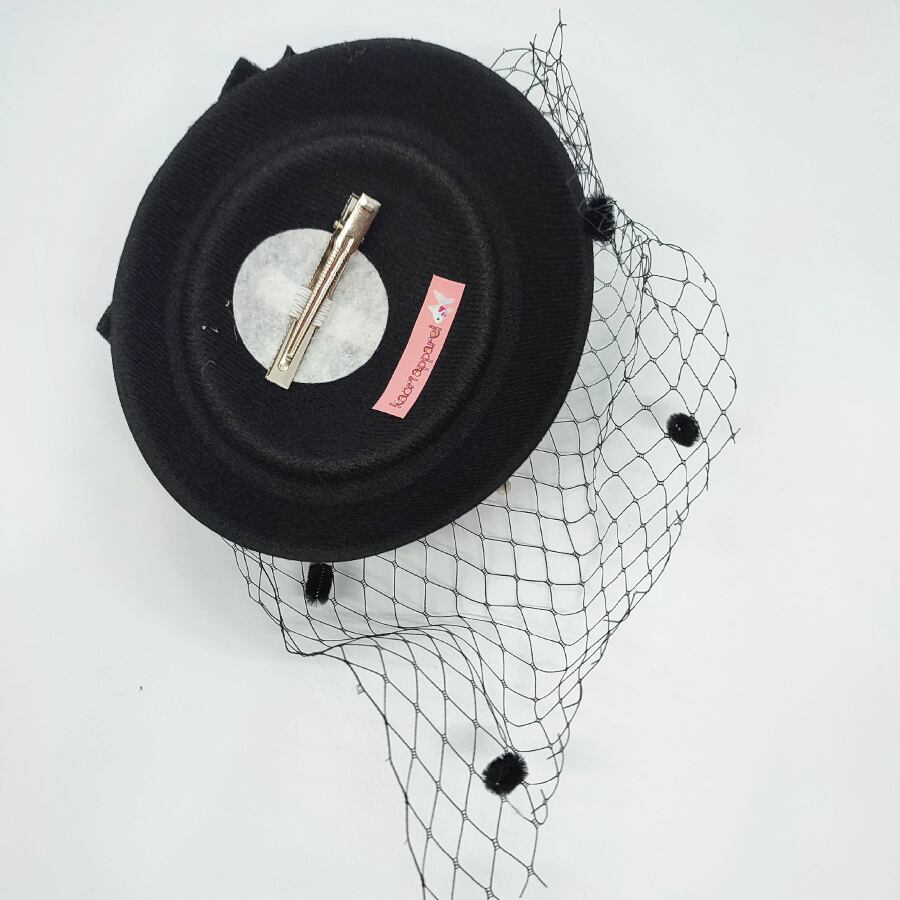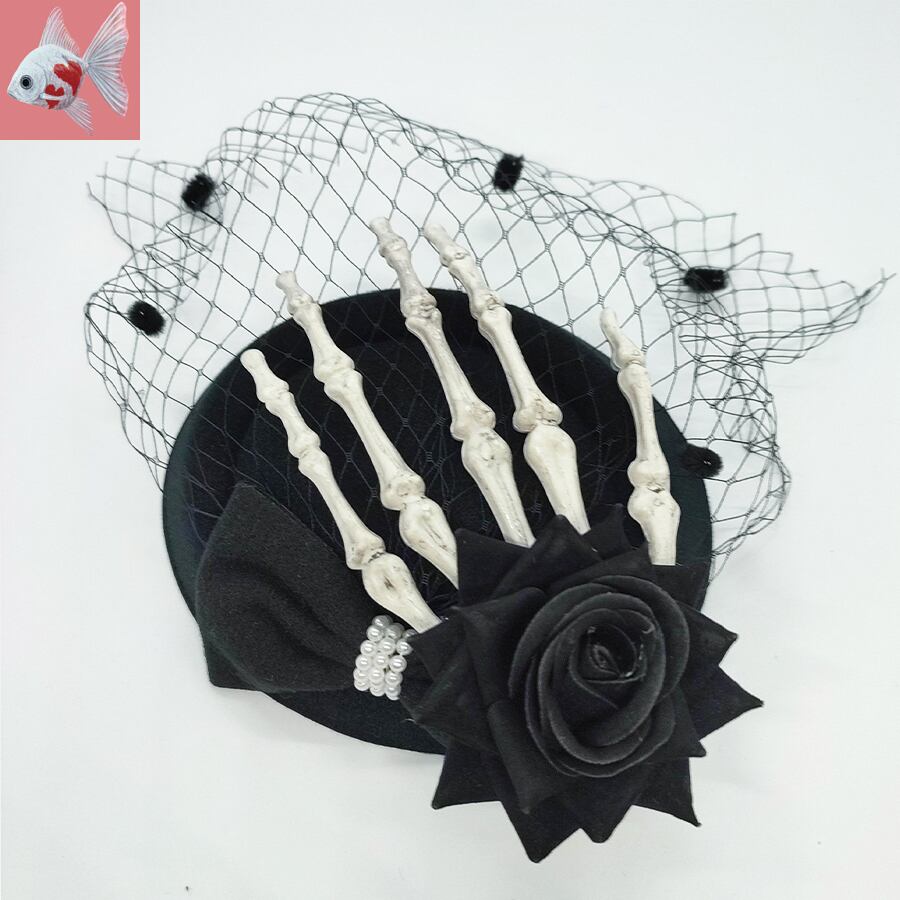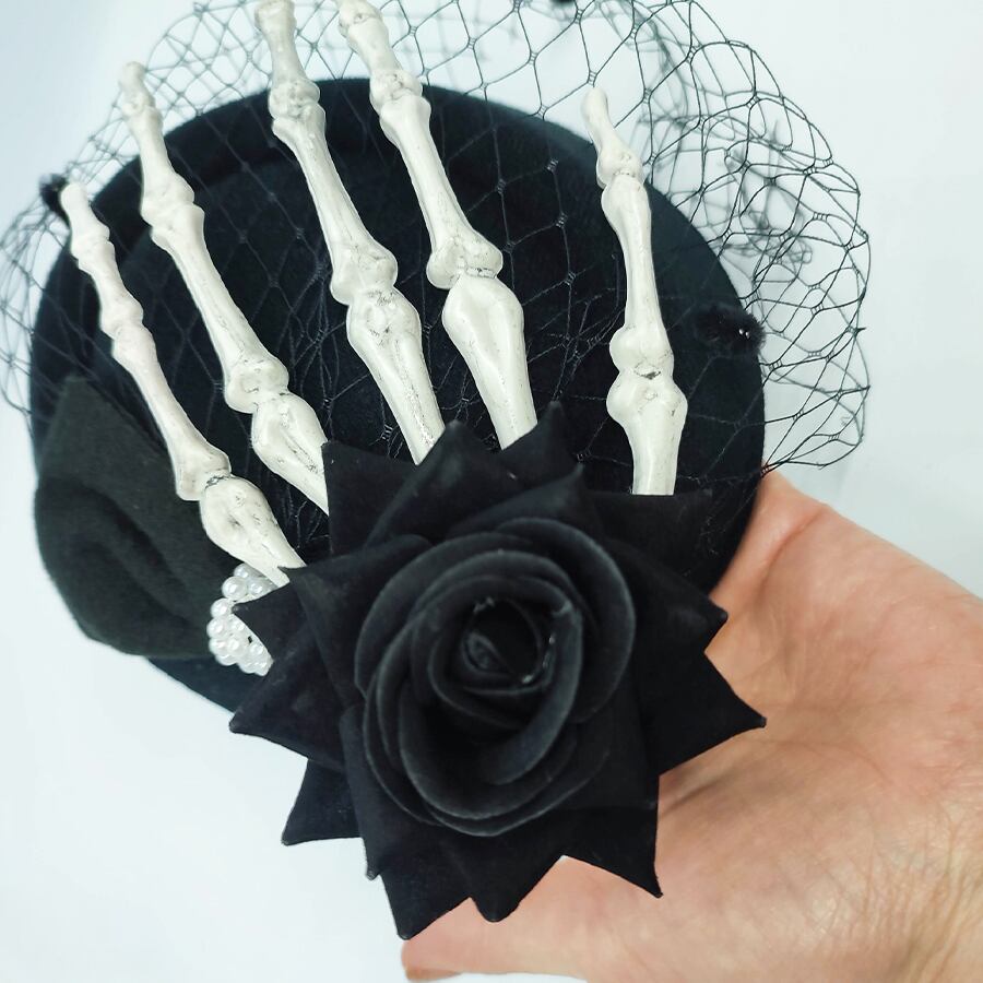 黒のリボンミニハットに、スカルの手と黒い薔薇飾りが付いています。