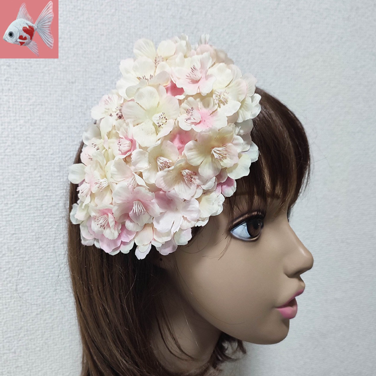 桜の造花がたくさん付いた、華やかなしずく型のヘッドドレスです