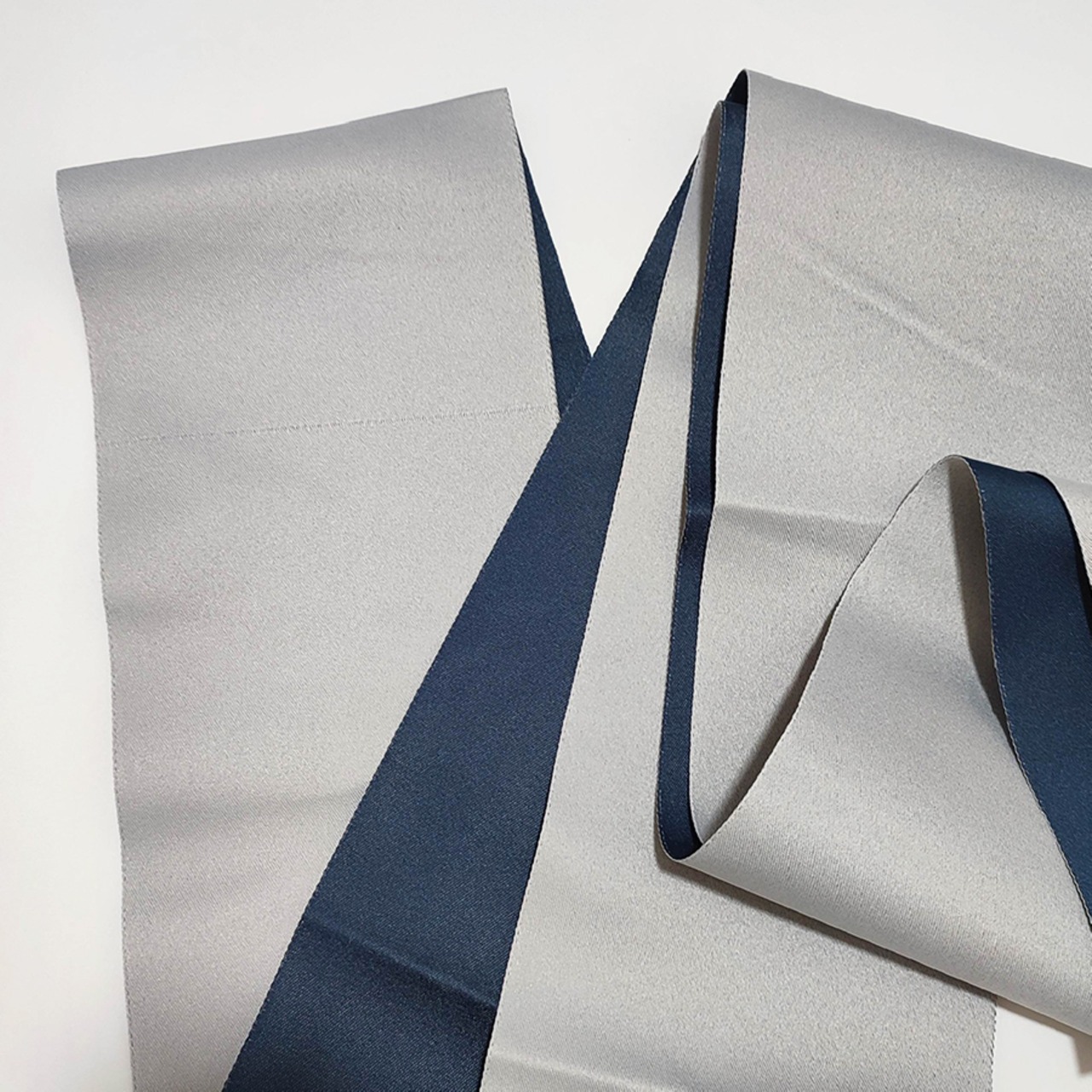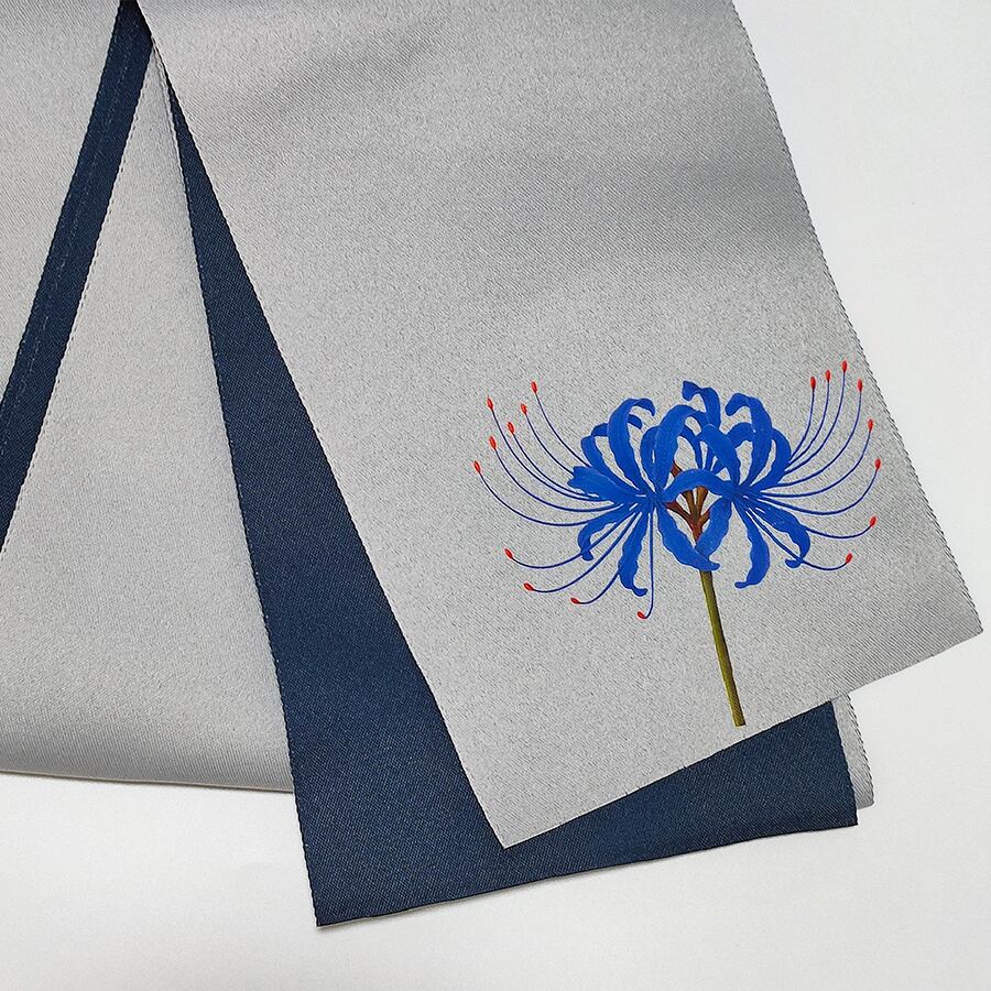青い彼岸花がプリントされた、薄グレーと紺の半幅帯です。