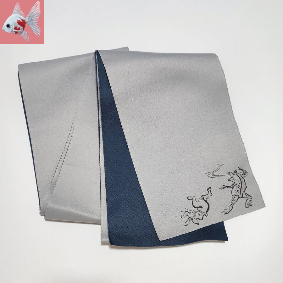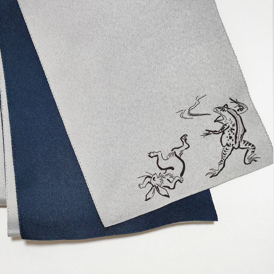蛙とウサギの鳥獣戯画がプリントされた、薄グレーと紺の半幅帯です。