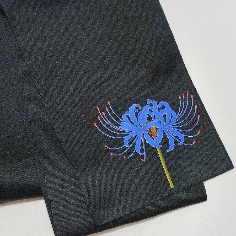青い彼岸花がプリントされた、両面黒の半幅帯です。