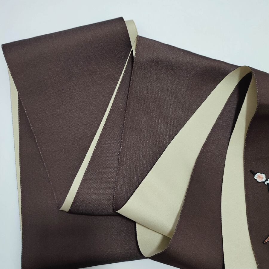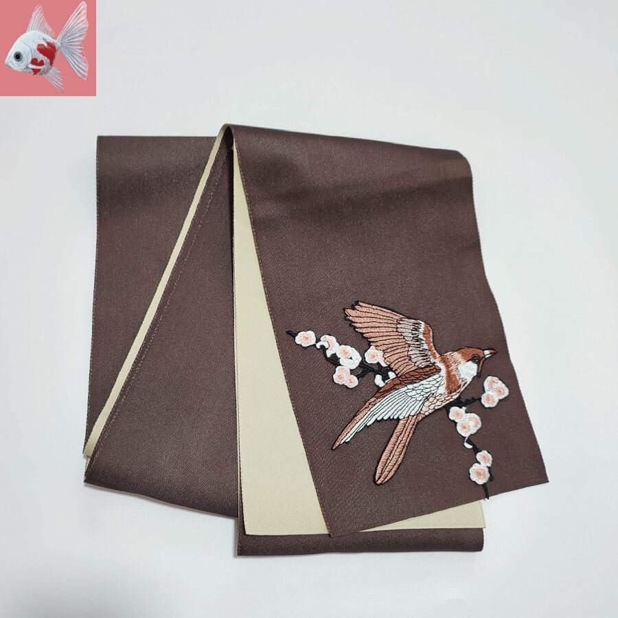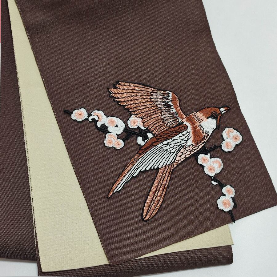 茶色とベージュの半幅帯に、可愛いスズメの刺繍飾りが付いています。