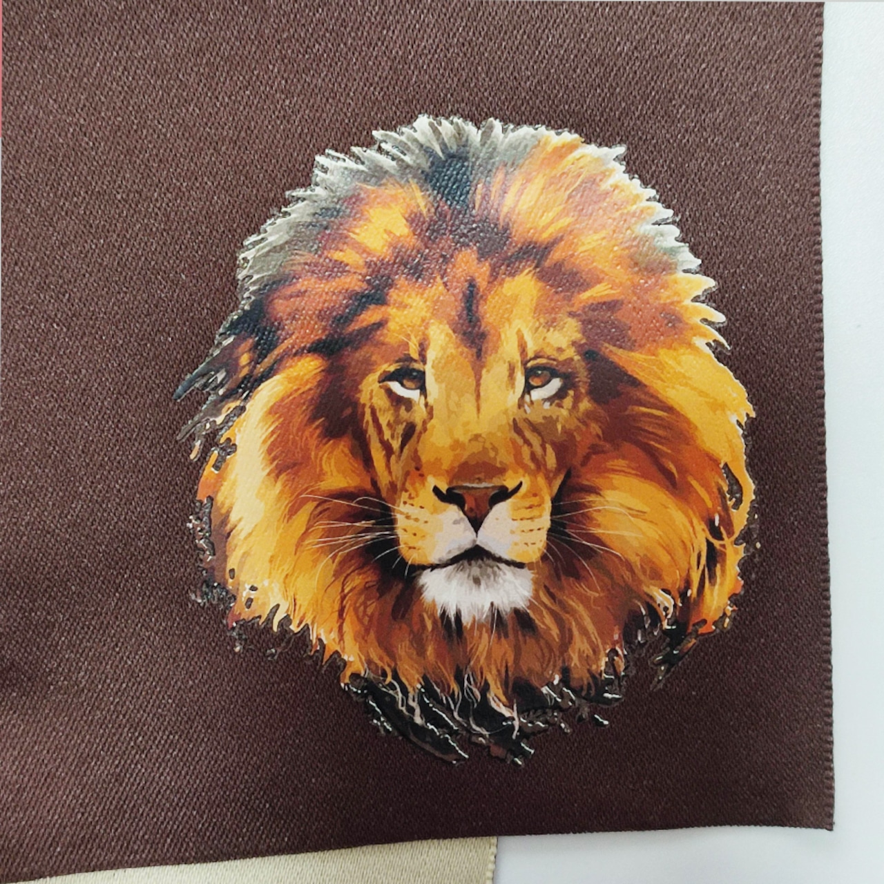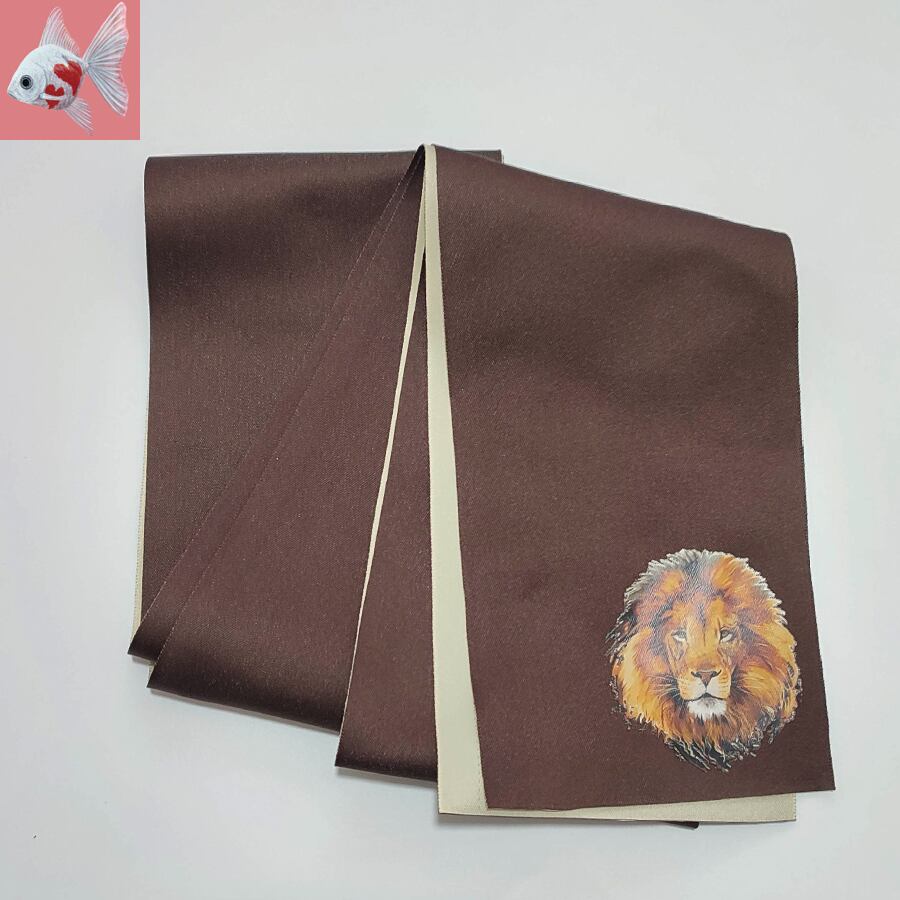 ライオンの顔がプリントされた茶とベージュの半幅帯です。