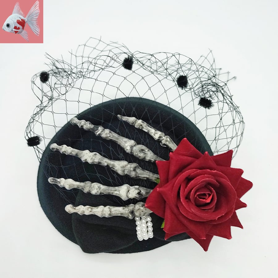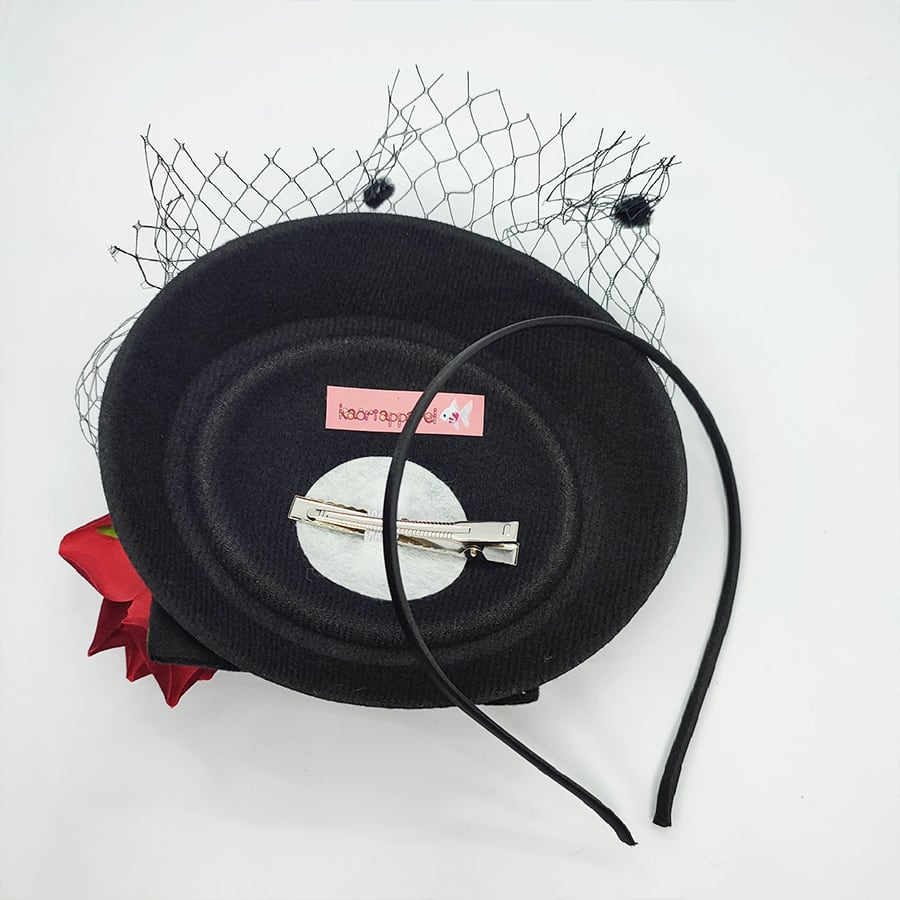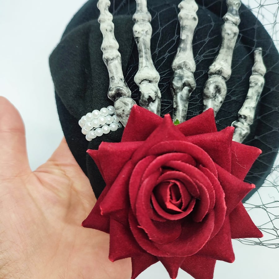 黒のリボンミニハットに、スカルの手と赤い薔薇飾りが付いています。
