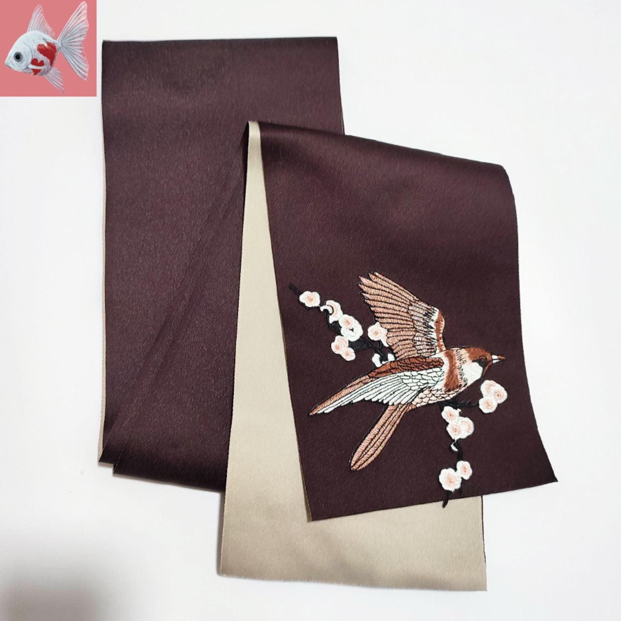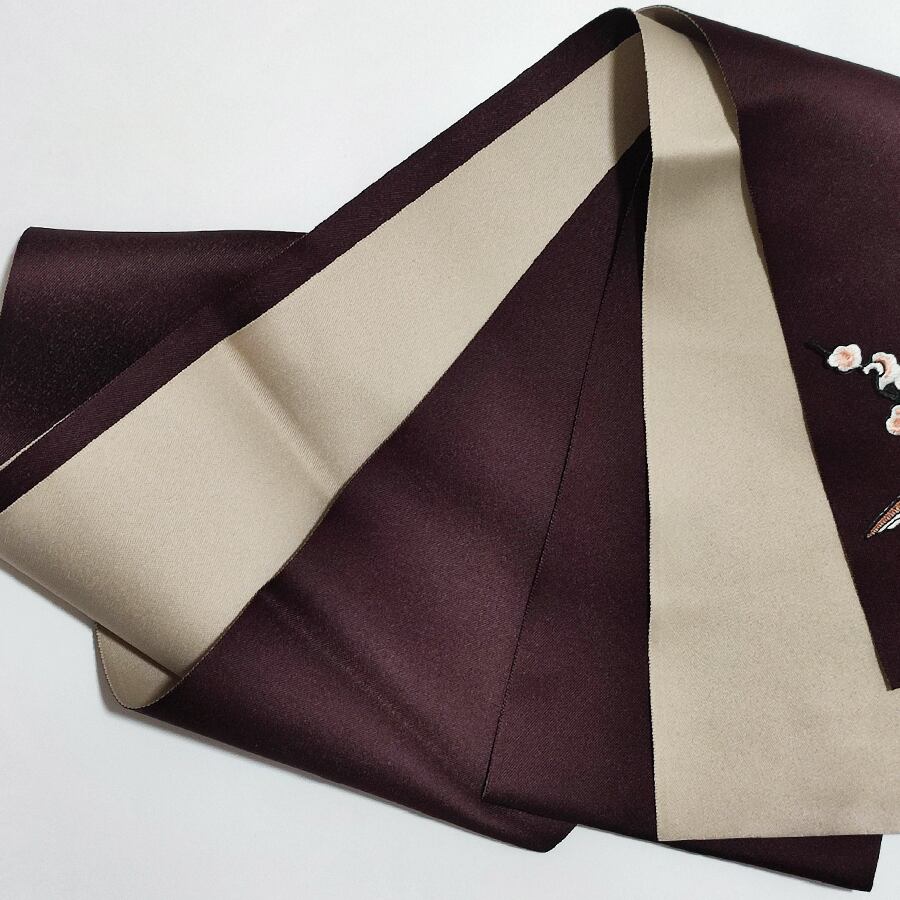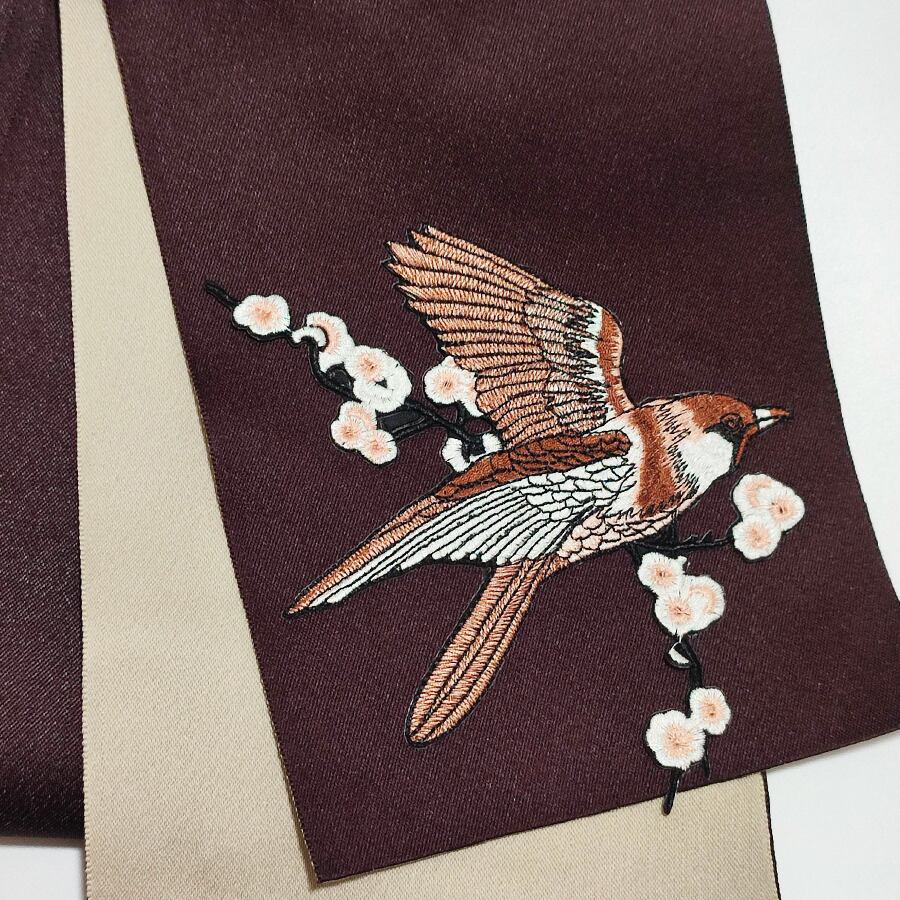 茶色とベージュの半幅帯に、可愛いスズメの刺繍飾りが付いています。