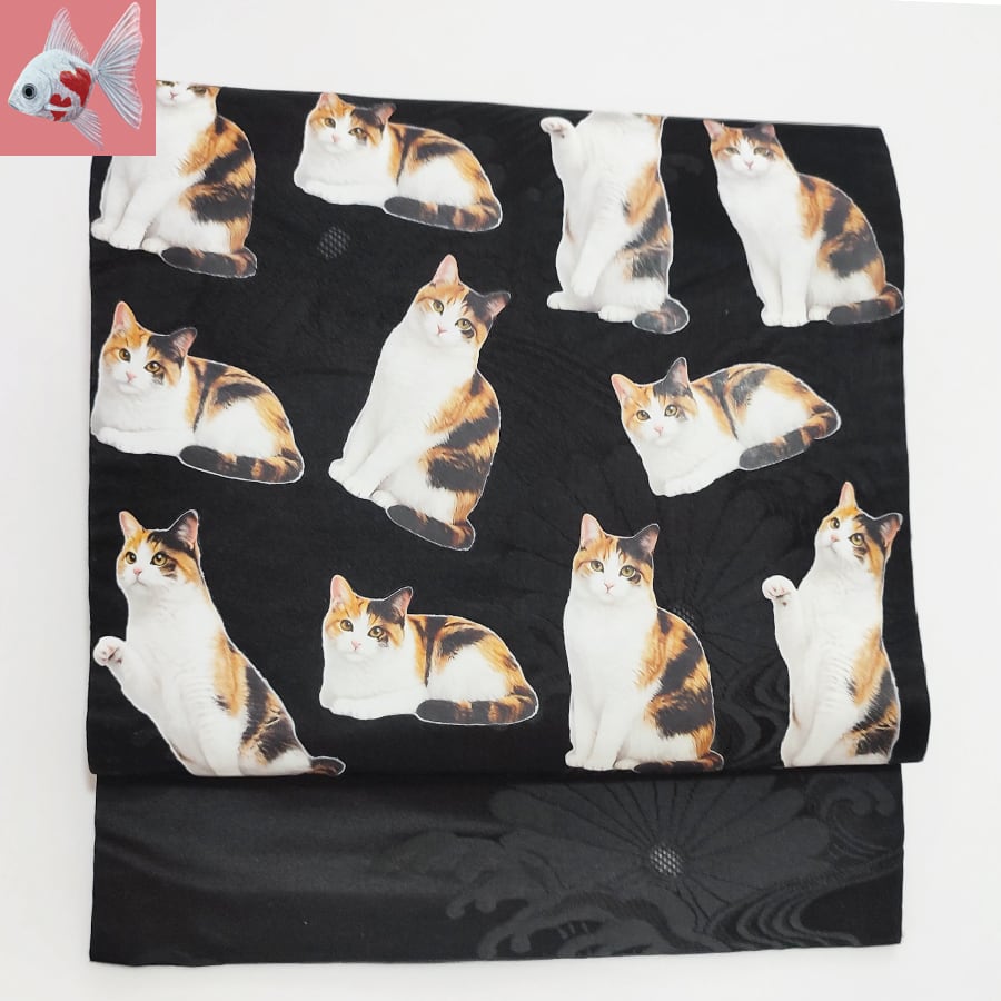 可愛い三毛猫達がプリントされた、黒の名古屋帯です。
