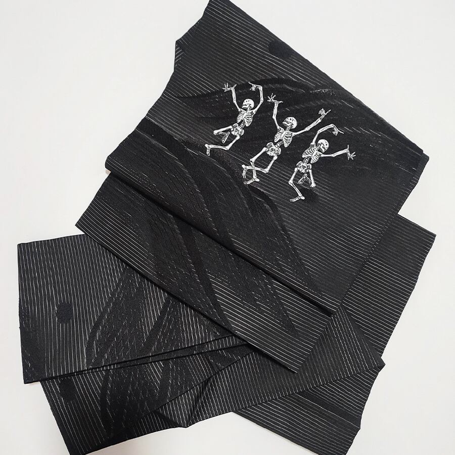 踊るスカルがプリントされた、黒の名古屋帯です。