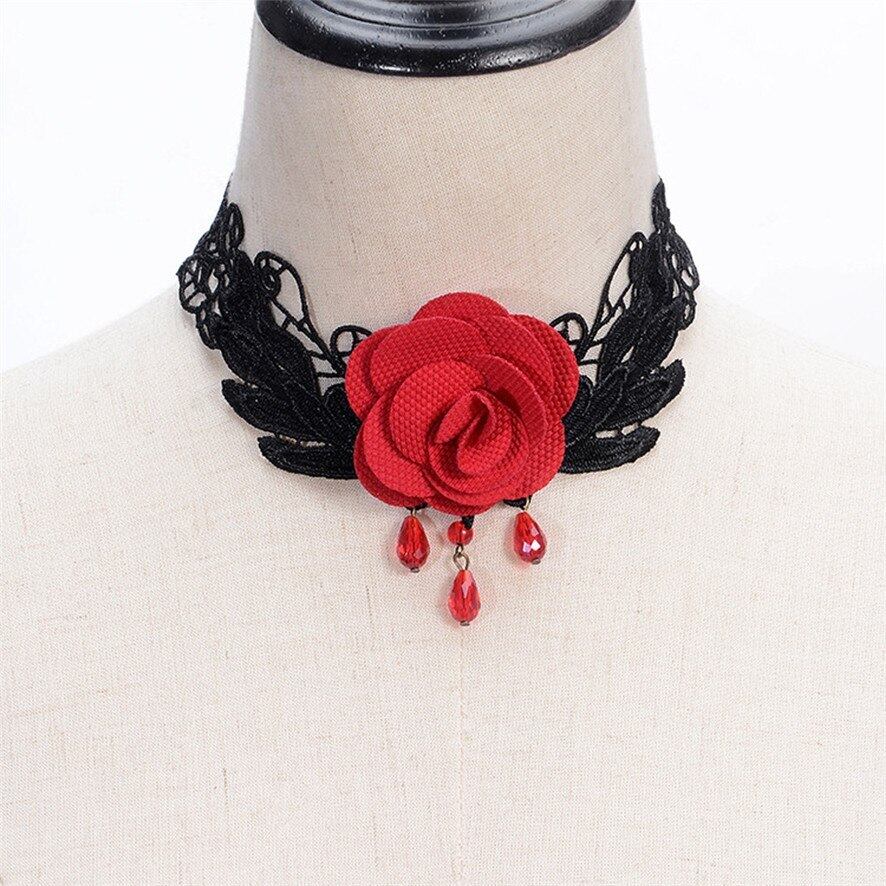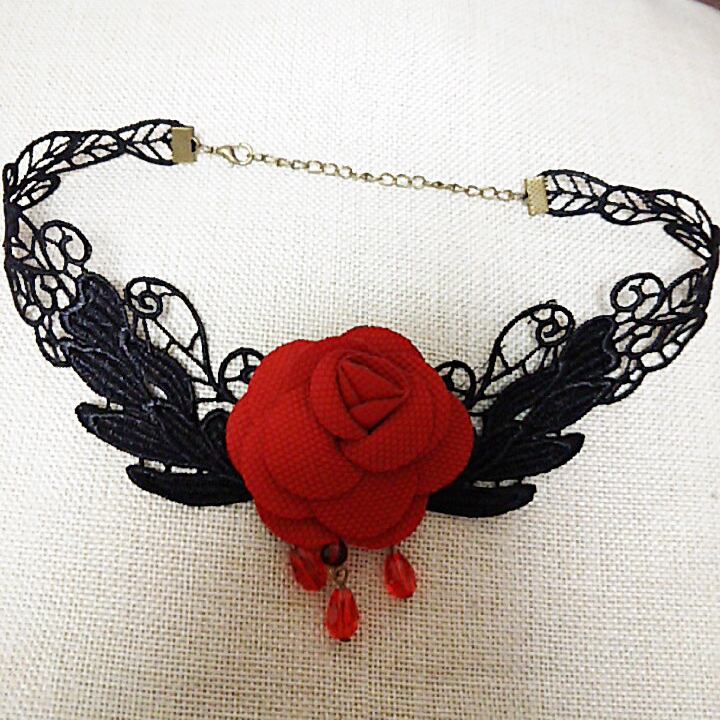 エレガントな黒レースと真っ赤なバラが素敵なネックレスです。