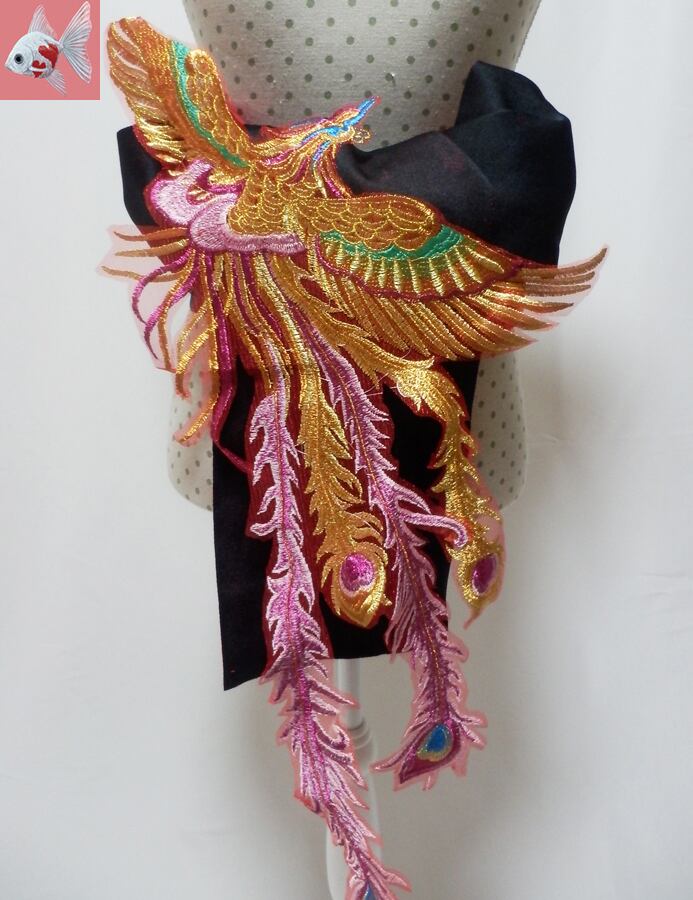 美しい刺繍で出来たダイナミックな鳳凰の帯飾りです。