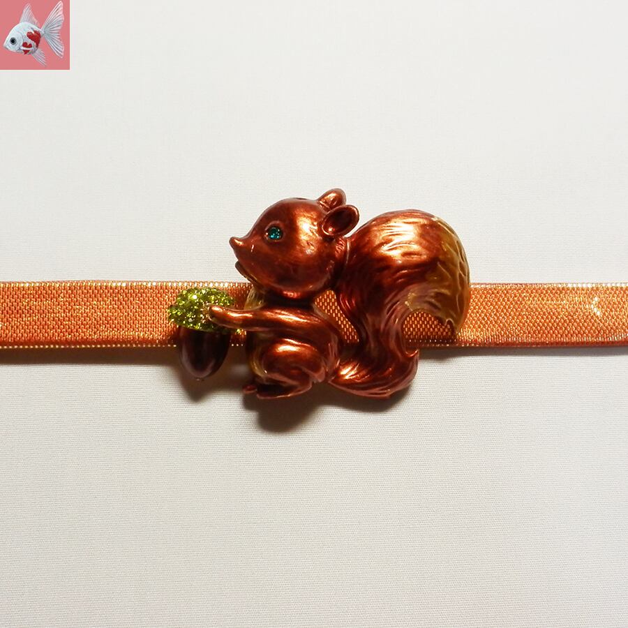 大きなどんぐりを持ったリスの帯留め飾りです。