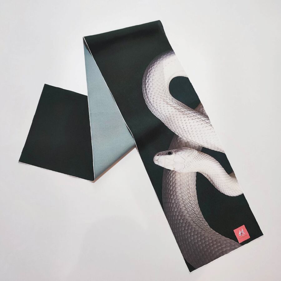 オリジナルでプリントした生地で、黒地に白蛇の絵です。