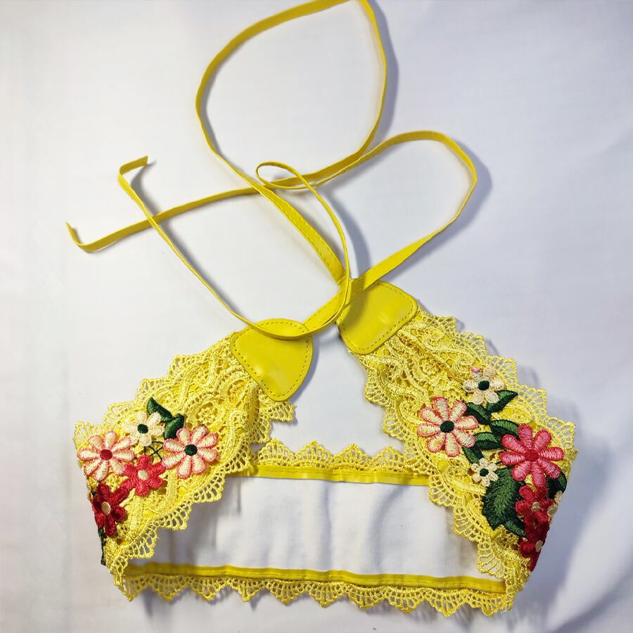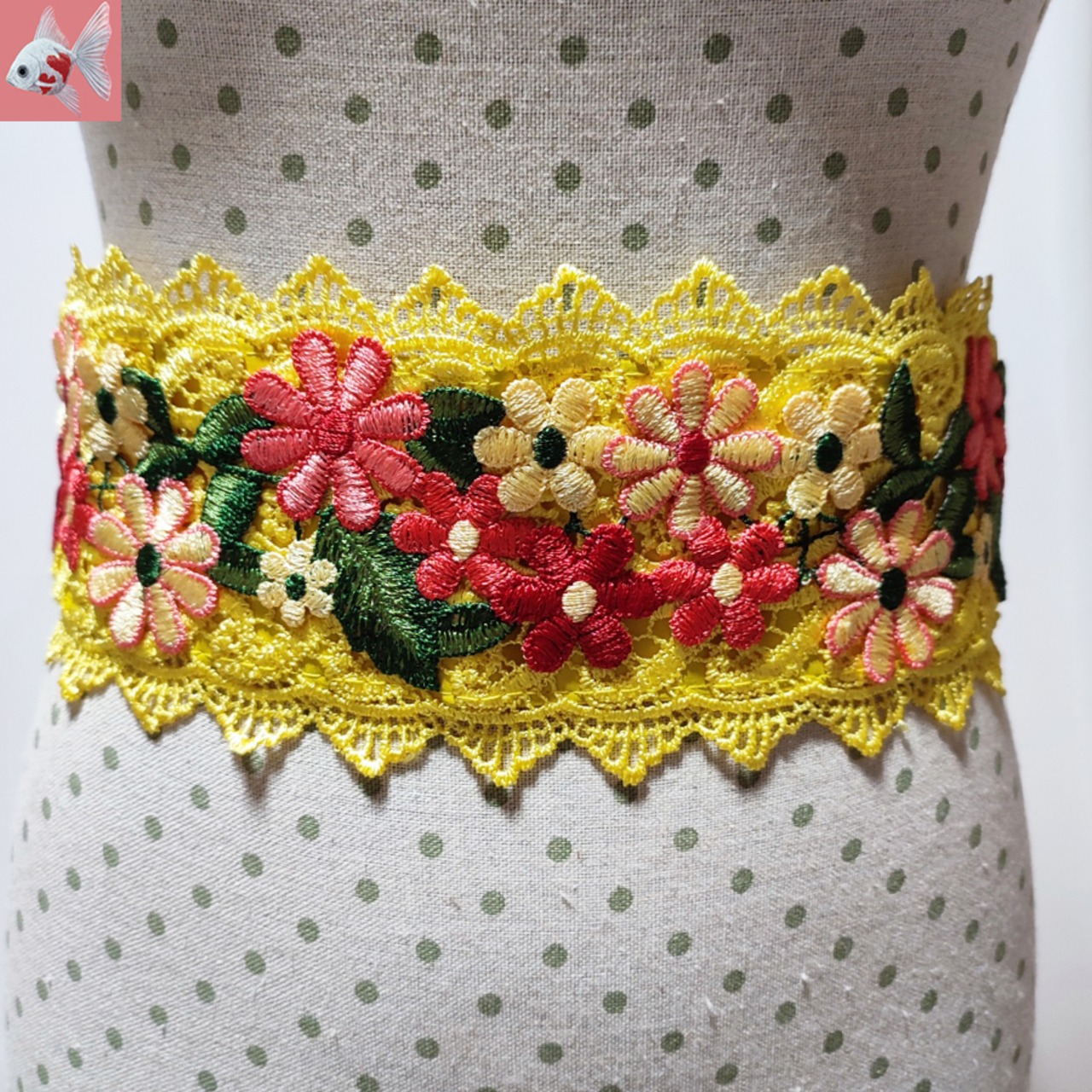 明るい黄色のレースのベルトにお花畑みたいな可愛い刺繍飾りが付いています。