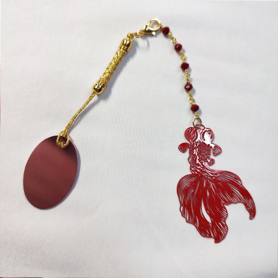 薄い金属で軽いです。赤いビーズのチェーンも可愛いです。