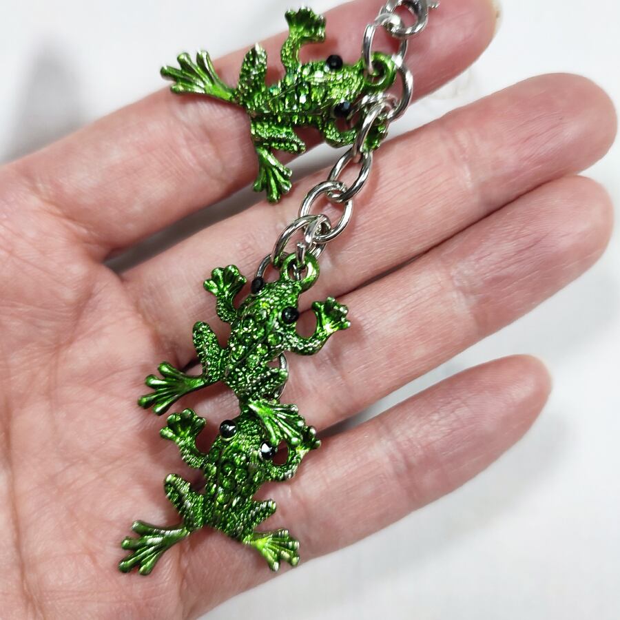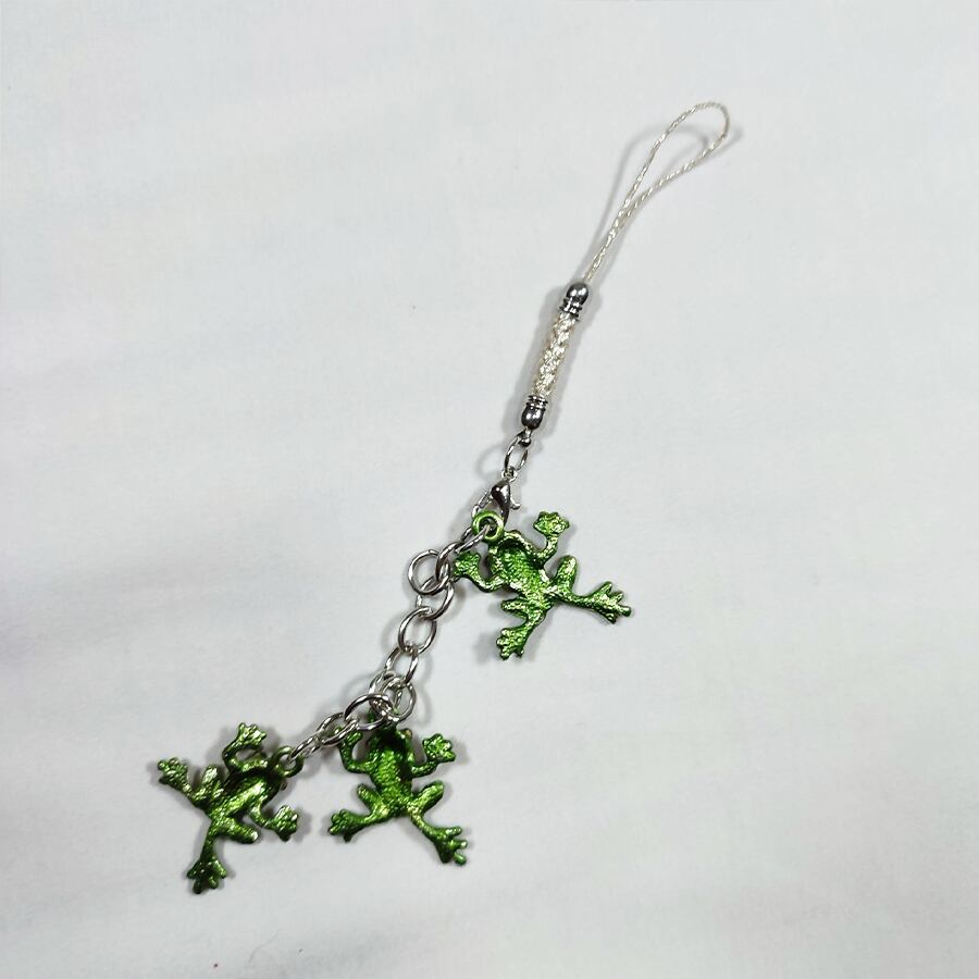 可愛らしい3匹の黄緑色のカエルの根付けです。