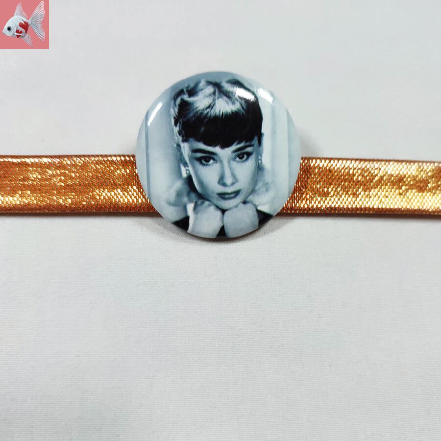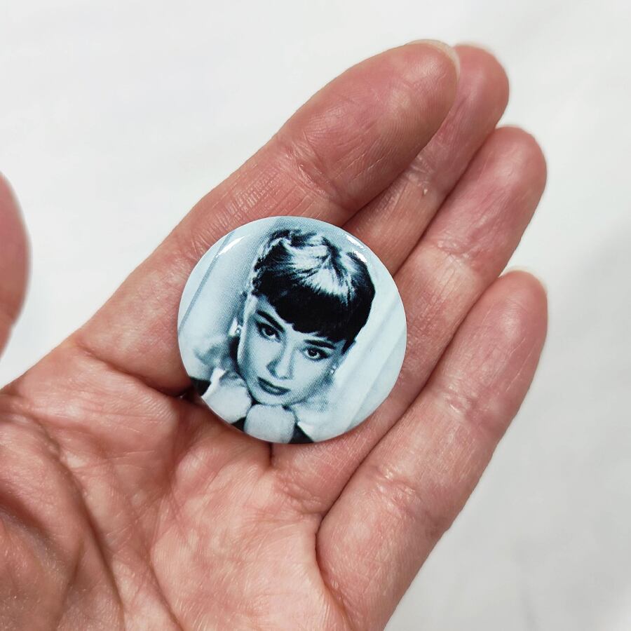 イギリス人女優、オードリー・ヘプバーンの缶バッジの帯留め飾りです。