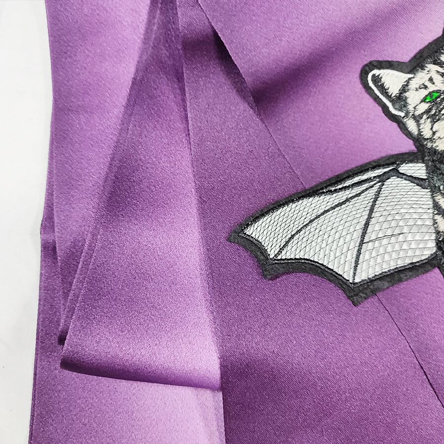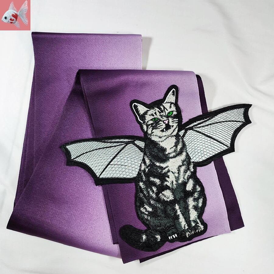 紫色のグラデーションの半幅帯に、コウモリ猫の刺繍飾りが付いています。