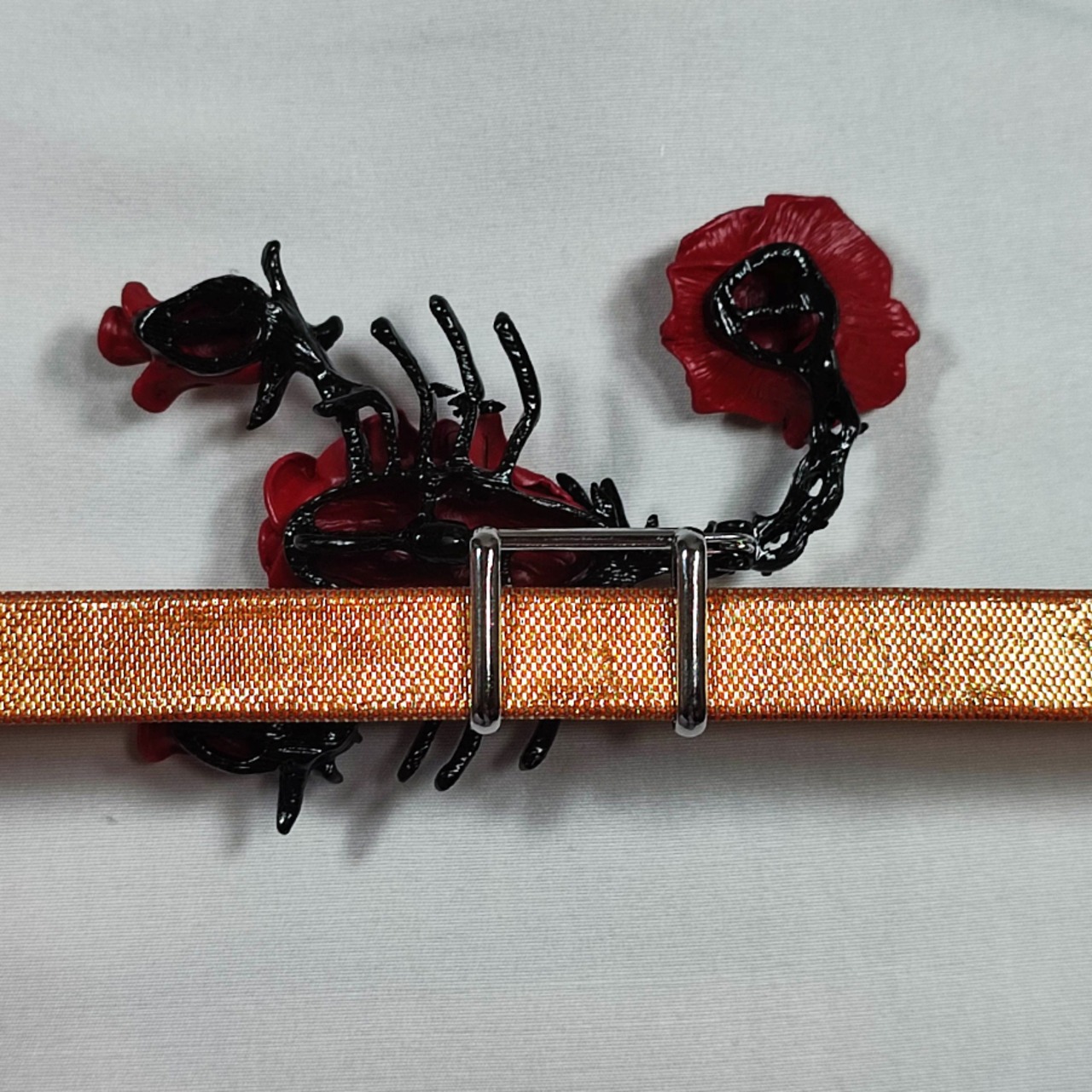 薔薇の花と棘のある茎で形作られた、サソリの帯留め飾りです。