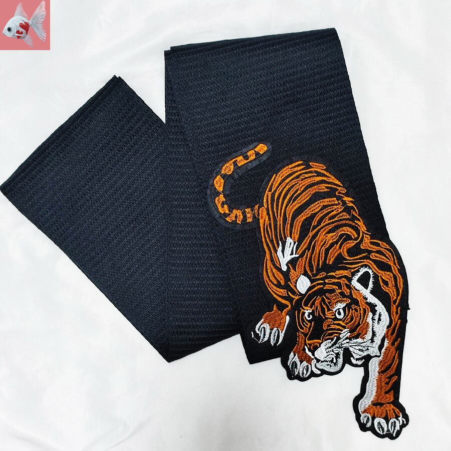 黒のはちす織の半幅帯に、刺繍で出来たカッコいい虎が付いています。