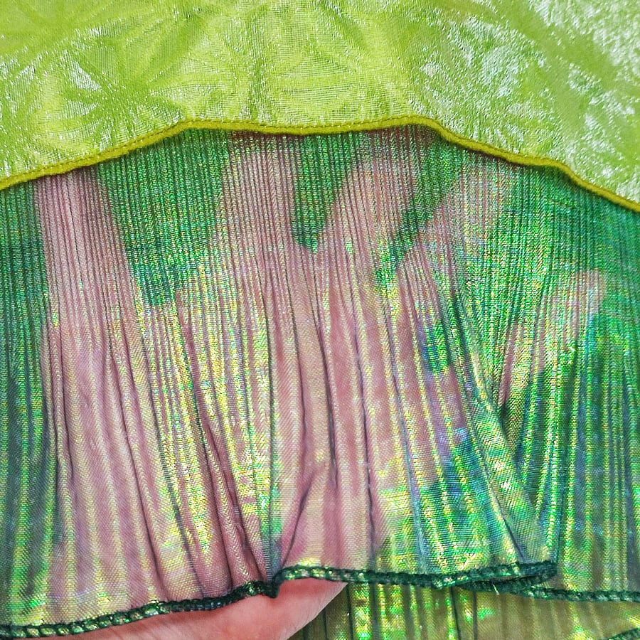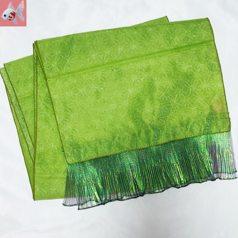 黄緑色の兵児帯に、魚の尾びれのようなレースが付いています。