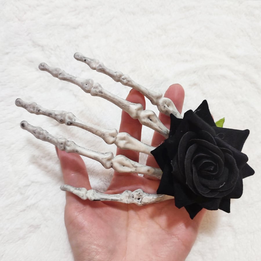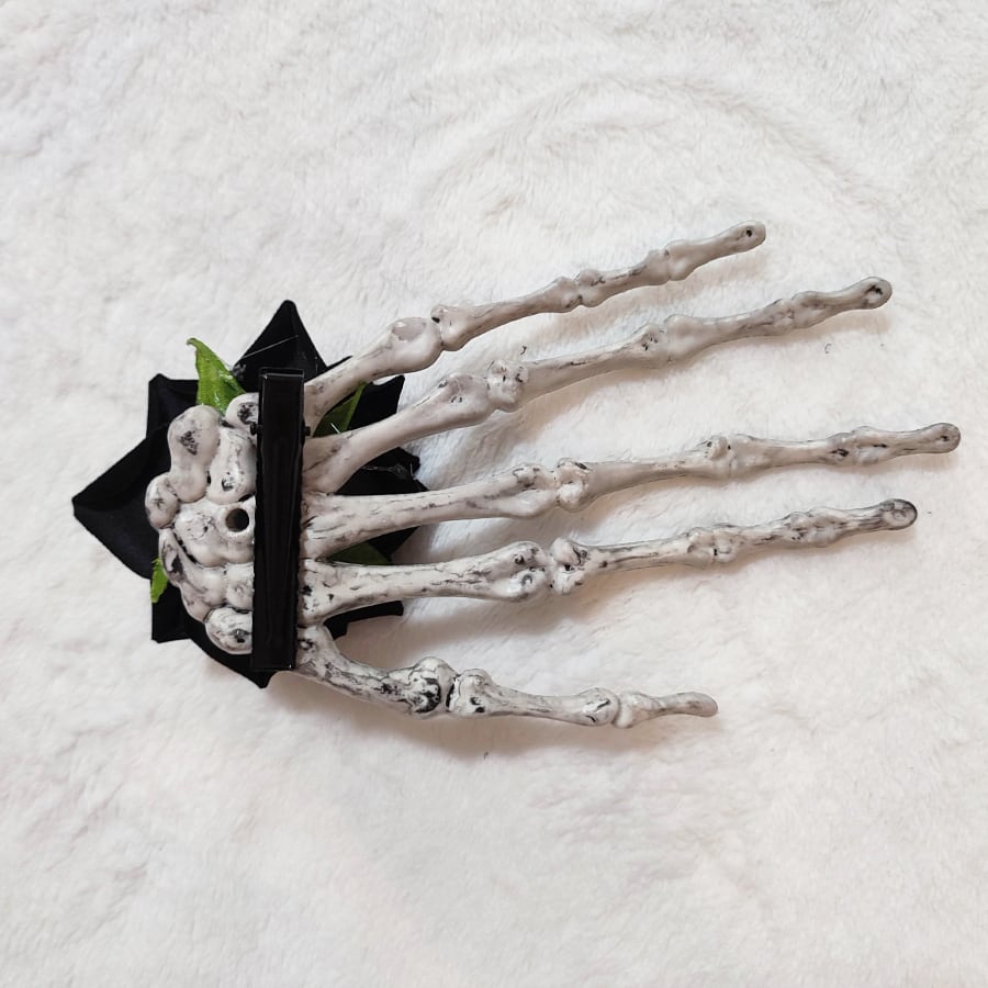 スカルの手と黒い薔薇飾りの帯留め飾りです。