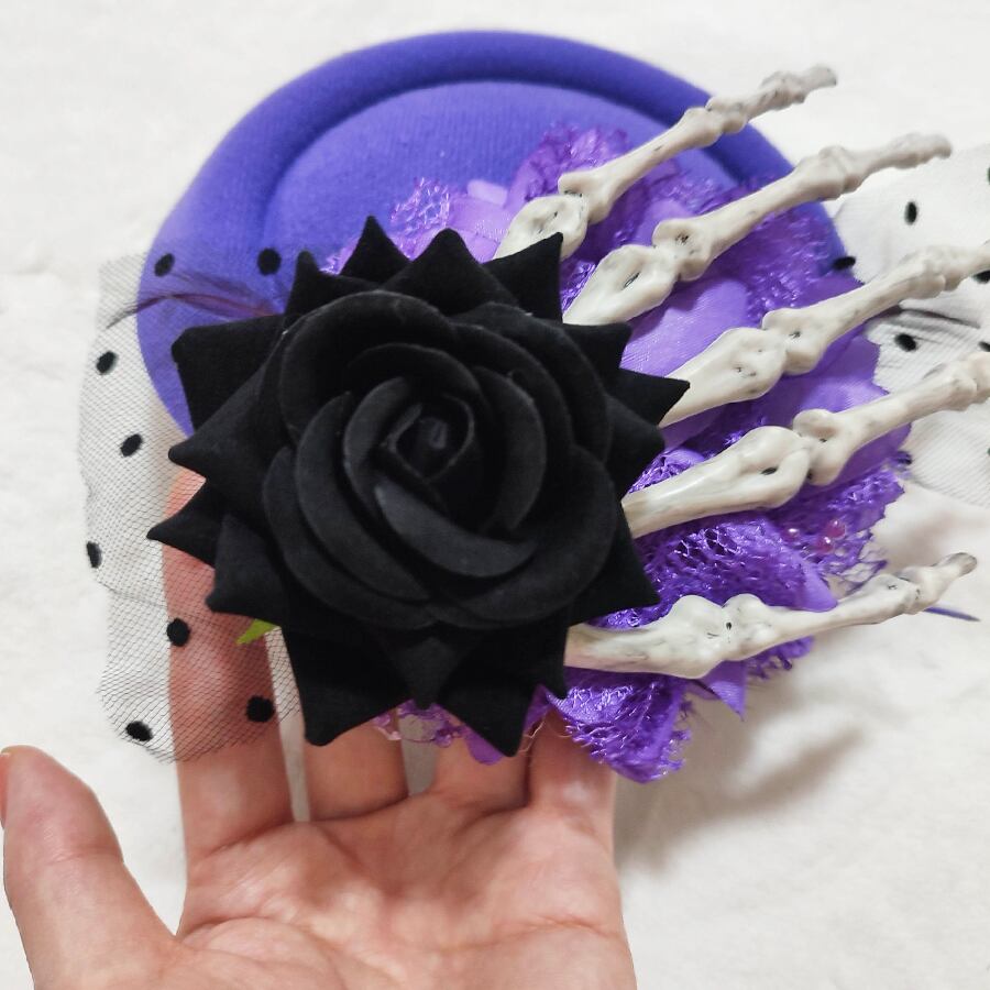 紫のミニハットに、スカルの手と黒い薔薇飾りが付いています。