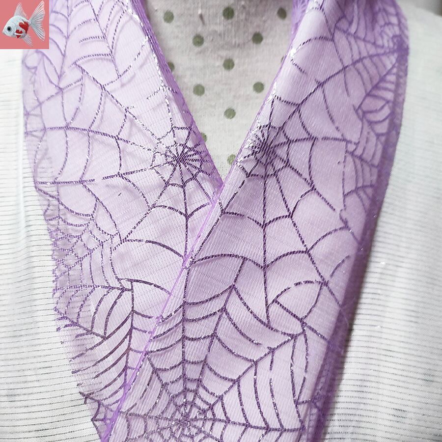 薄紫のオーガンジー生地にメタリックシルバーのクモとクモの巣が綺麗です。