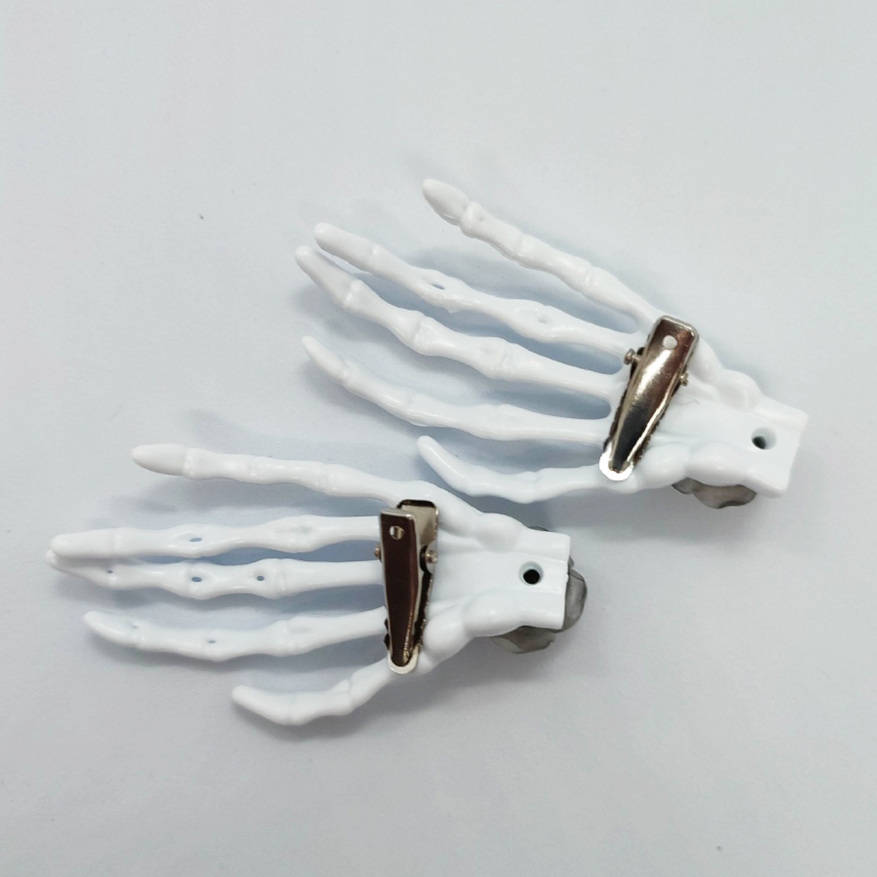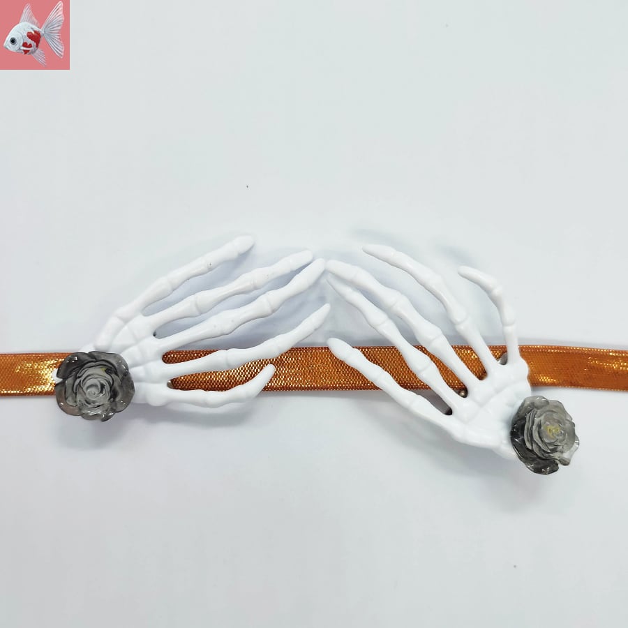 グレーのミニ薔薇が付いたスカルの手の帯留め飾りです。