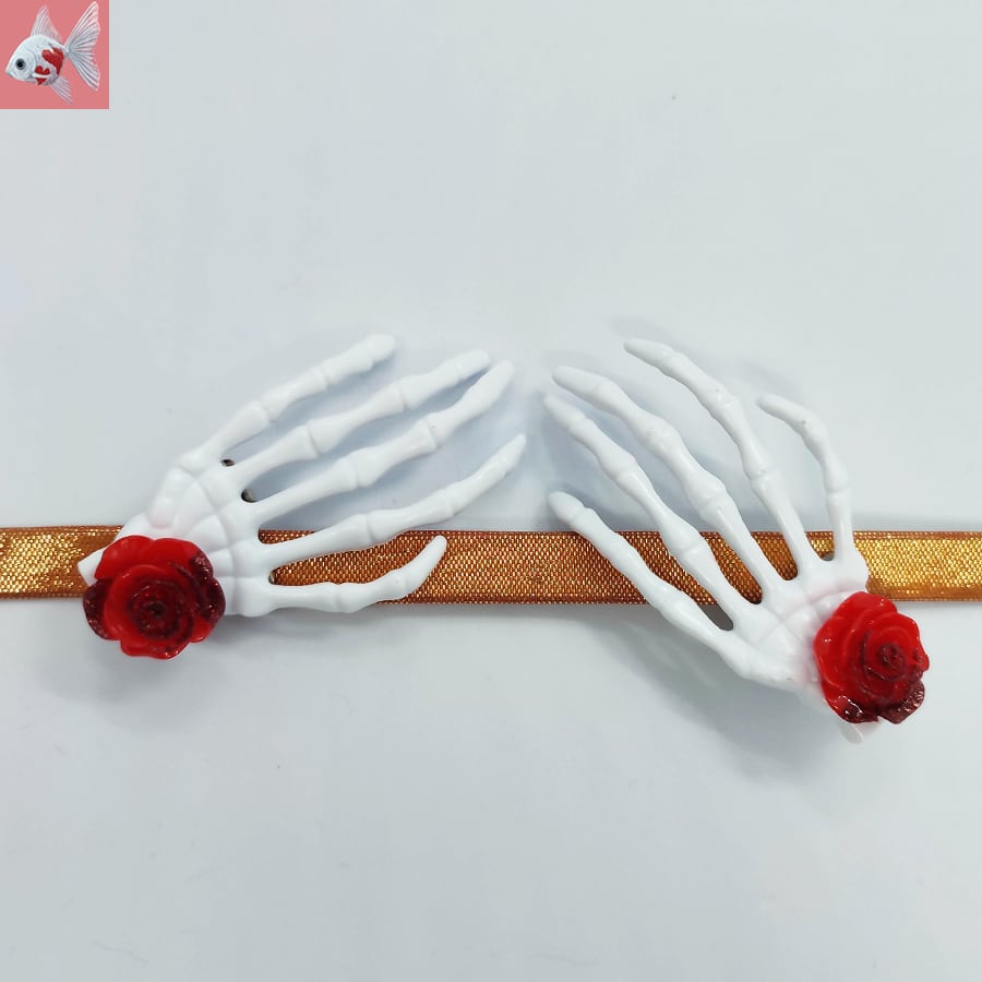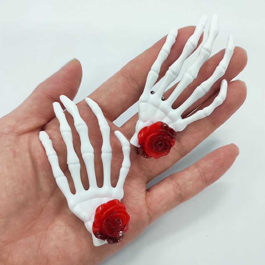 赤いミニ薔薇が付いたスカルの手の帯留め飾りです。