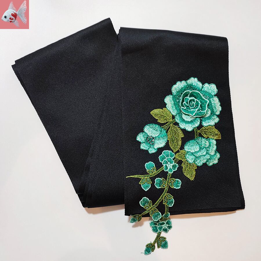 両面黒の半幅帯に、グリーンのお花の刺繍飾りが付いています。