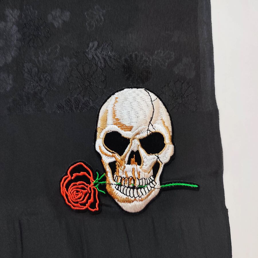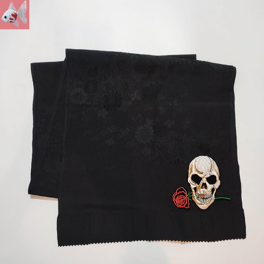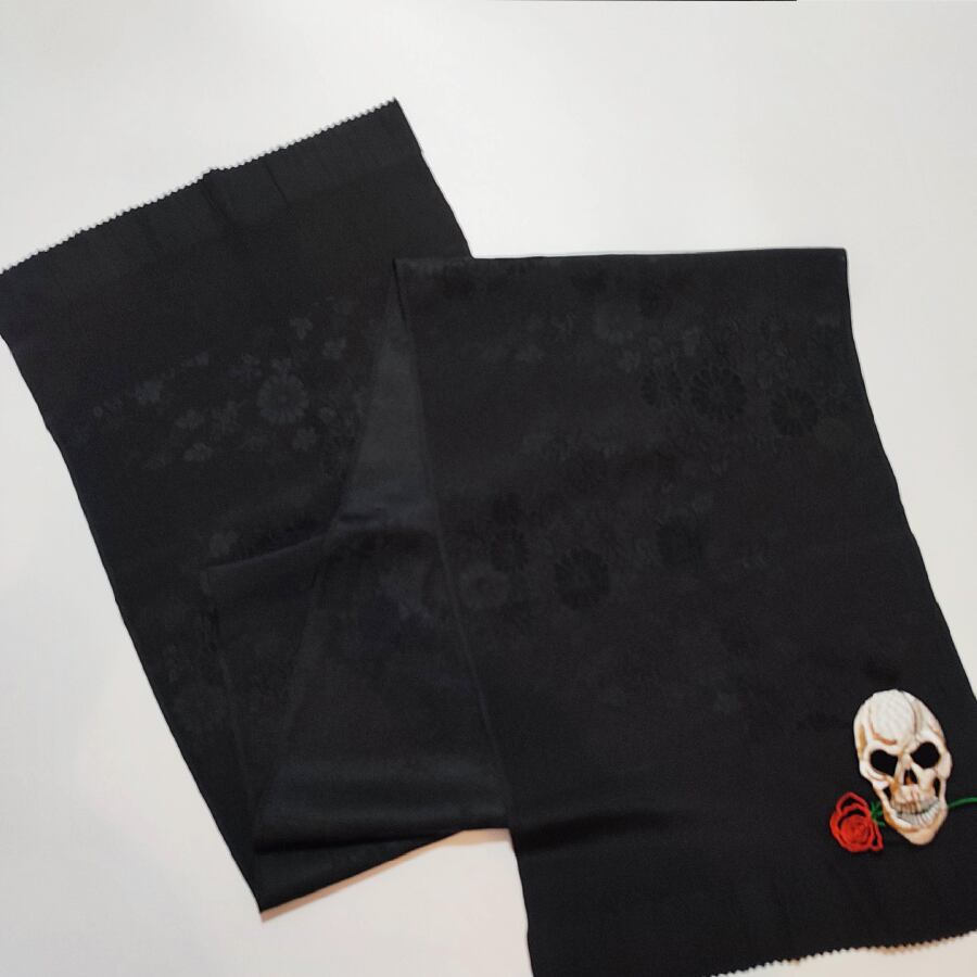 黒い帯揚げに、薔薇をくわえたスカルの刺繍飾りが付いています。