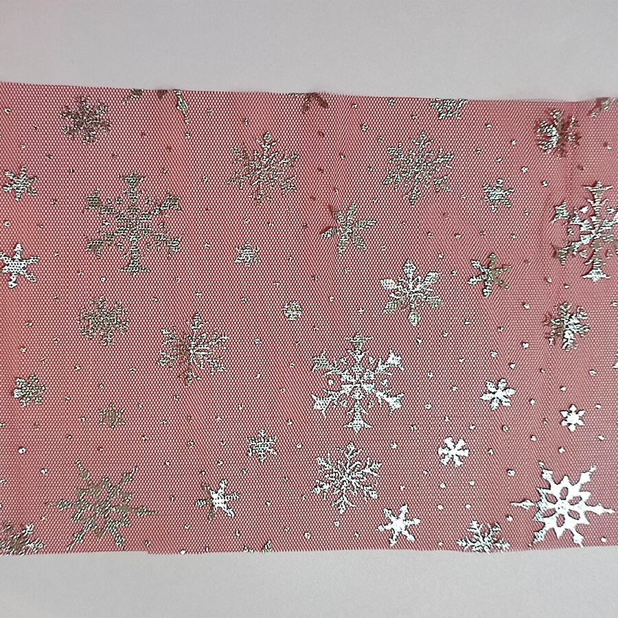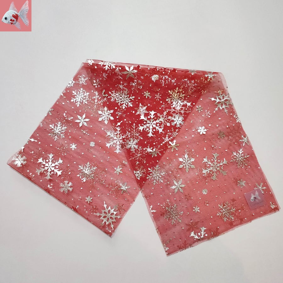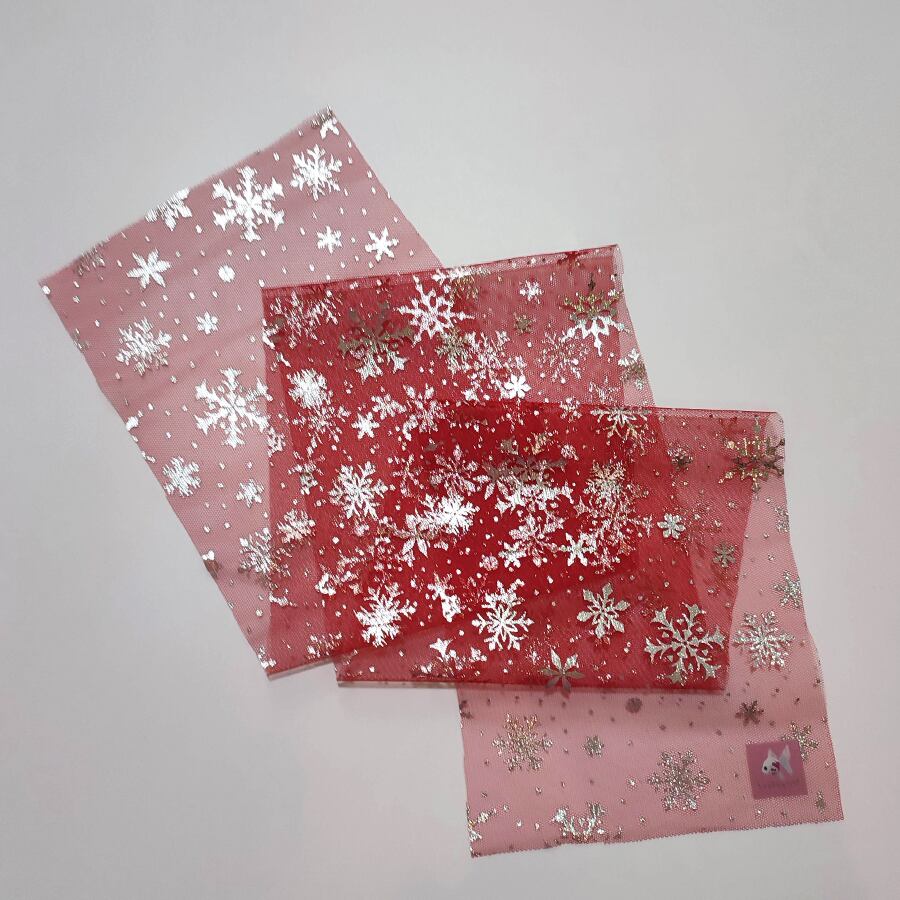 透ける赤のチュール生地に銀色の雪の結晶がキラキラ輝いて、とても綺麗です。