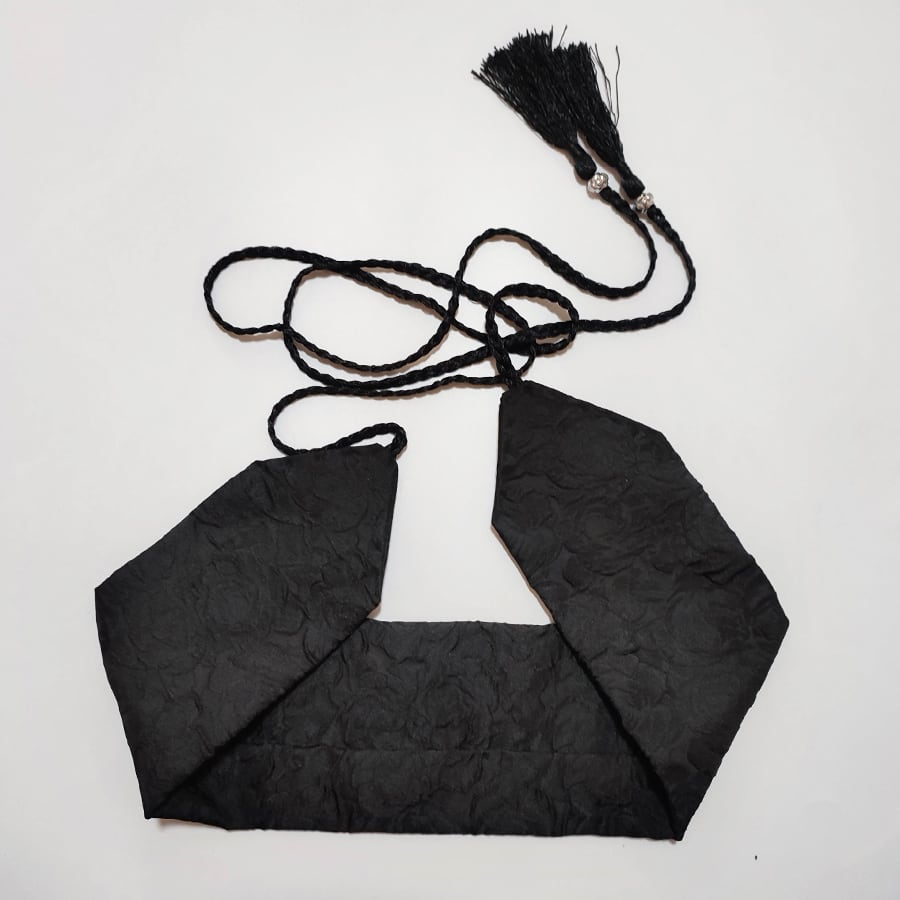 立体感のある黒い薔薇柄の織物のベルトに、赤い刺繍の薔薇飾りが付いています。