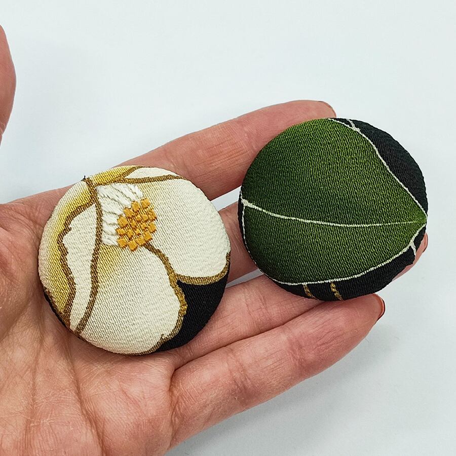 黒留袖の柄部分をくるみボタンにした帯留め飾りです。