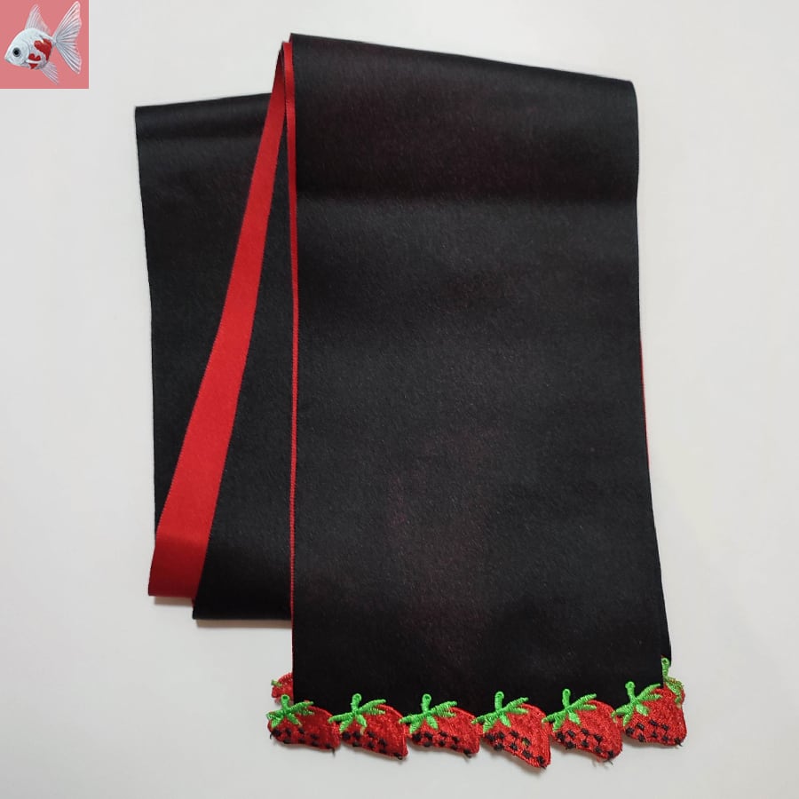 黒と赤の半幅帯の両端に、赤いイチゴの刺繍飾りが付いています。